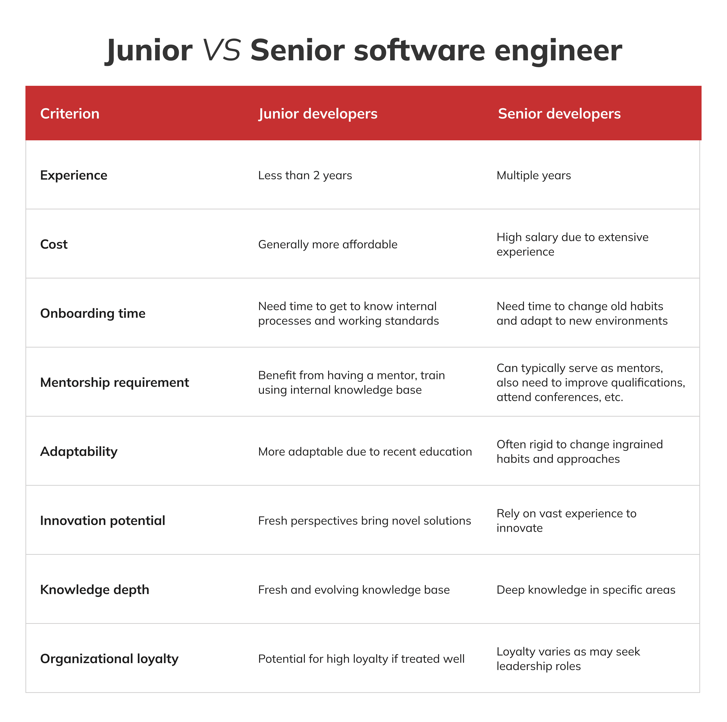 Besides, hiring a junior developer is more cost-effective not only due to their lower base salary. Since benefits typically cost 25% to 40% of an employee’s base salary, a junior developer with a lower salary means lower absolute benefits costs. For example, if a junior developer earns $50,000, the benefits would cost an additional $12,500 to $20,000 annually. In contrast, a higher-salaried senior developer would incur proportionately higher benefits costs. Therefore, the total compensation package for a junior developer, including both salary and benefits, represents a significantly lower financial commitment for the employer compared to more experienced developers.