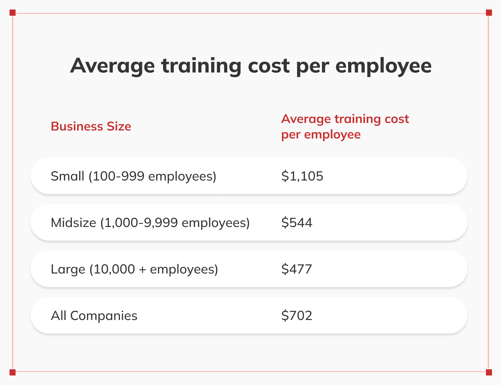 I USA er småskalabedrifter, som har en arbeidsstyrke på mellom 100 og 999 ansatte,tildeleover $1 000 per ansatt hvert år til opplæringsformål. Dette er høyere enn hva større selskaper, med 10 000 eller flere ansatte, bruker på tilsvarende opplæring per ansatt, som ligger på ca. $447 årlig. Mellomstore selskaper, med mellom 1 000 og 9 999 ansatte, bruker rundt $545 per ansatt hvert år på opplæring.