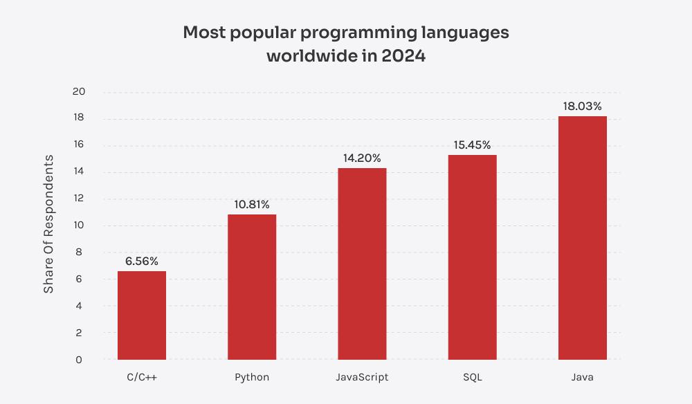 Java har vært en viktig aktør innen programvareutvikling for bedrifter i flere tiår – og det kommer ikke til å forsvinne. Selv ikke i 2024,det er et av de mest brukte og testede språkene, og rangerer helt der oppe sammen med JavaScript, SQL og Python. Det er tydelig at bedrifter fortsatt stoler på at Java driver de mest kritiske applikasjonene deres.