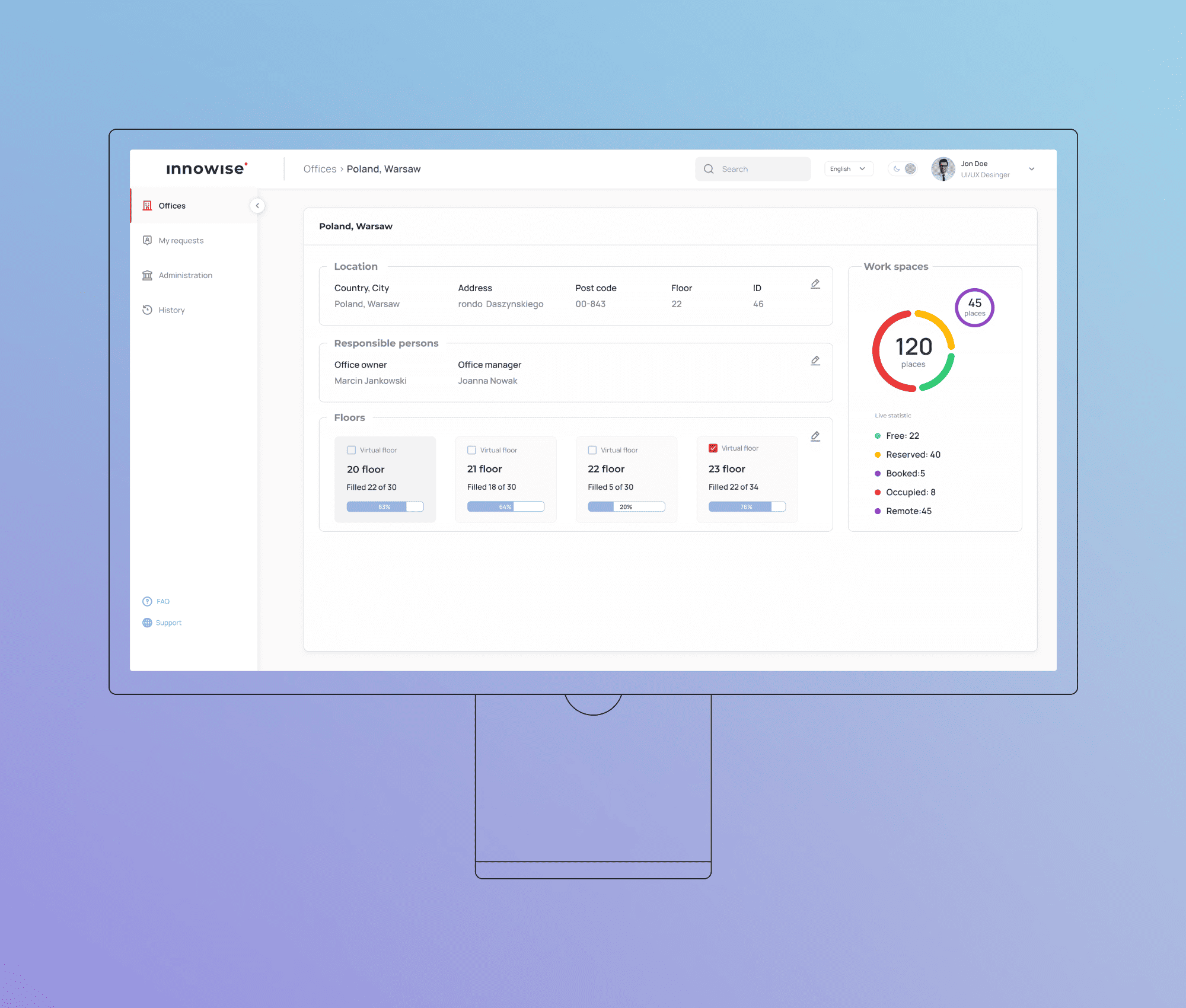 I dag bruker mer enn 1500 ansatte i Innowise Office Hoteling-systemet daglig, noe som gir dem et fleksibelt arbeidsmiljø og gjør det enkelt å samarbeide med kolleger.