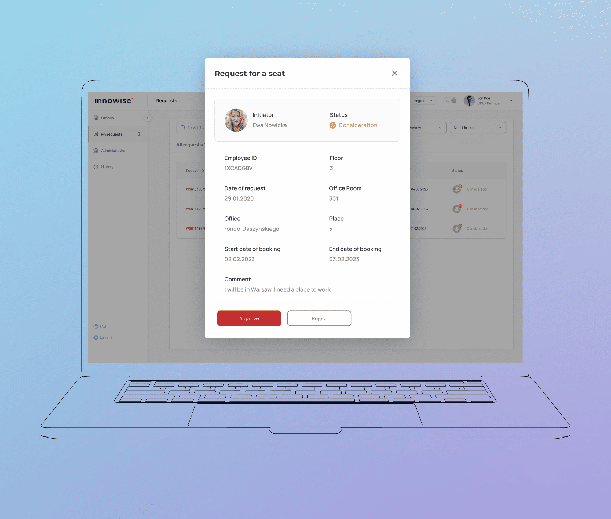 Oppdag hvordan Innowise utviklet et skrivebordsreservasjonssystem som gir ansatte fleksibilitet og effektivt arbeidsmiljø.