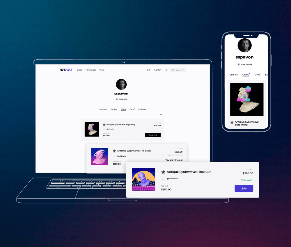 På grunn av det tette samarbeidet mellom vår forretningsanalytiker og prosjektleder med klienten, klarte vi å gjøre konseptet med en whitelabel-applikasjon til en fullt fungerende fleksibel plattform for salg av NFT-varer for både krypto- og fiat-valutaer.