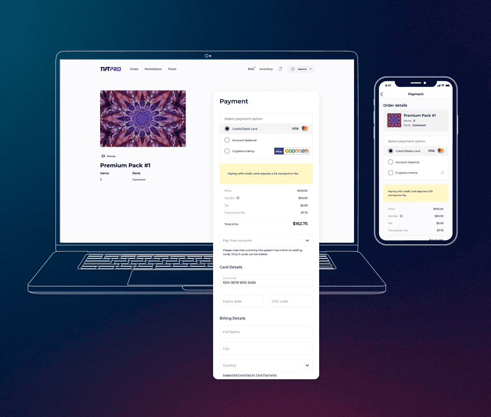 For å muliggjøre NFT-handel utviklet vi en algoritme som gjør det mulig å selge tokens gjennom smarte kontrakter og implementerte funksjonaliteten til betaling med bankkort eller kryptovaluta.